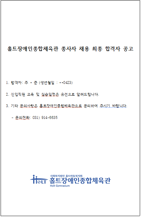 홀트장애인종합체육관 계약직 종사자 최종합격자 공고
