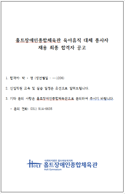 홀트장애인종합체육관 육아휴직 대체종사자 최종합격자 공고