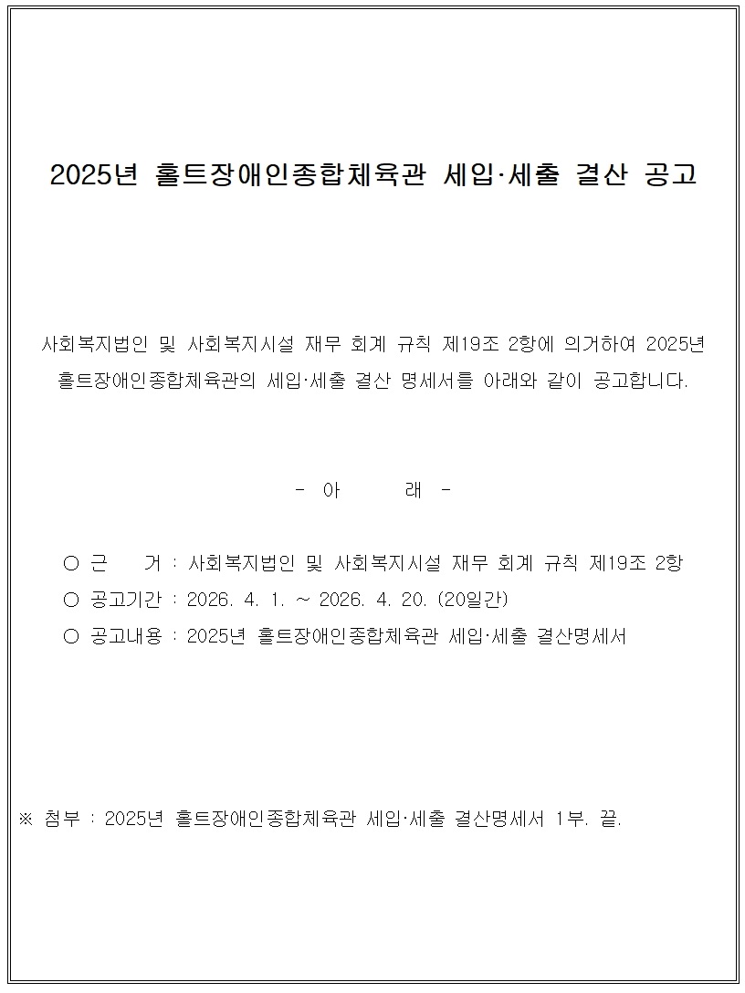 2025년 홀트장애인종합체육관 세입·세출 결산 공고